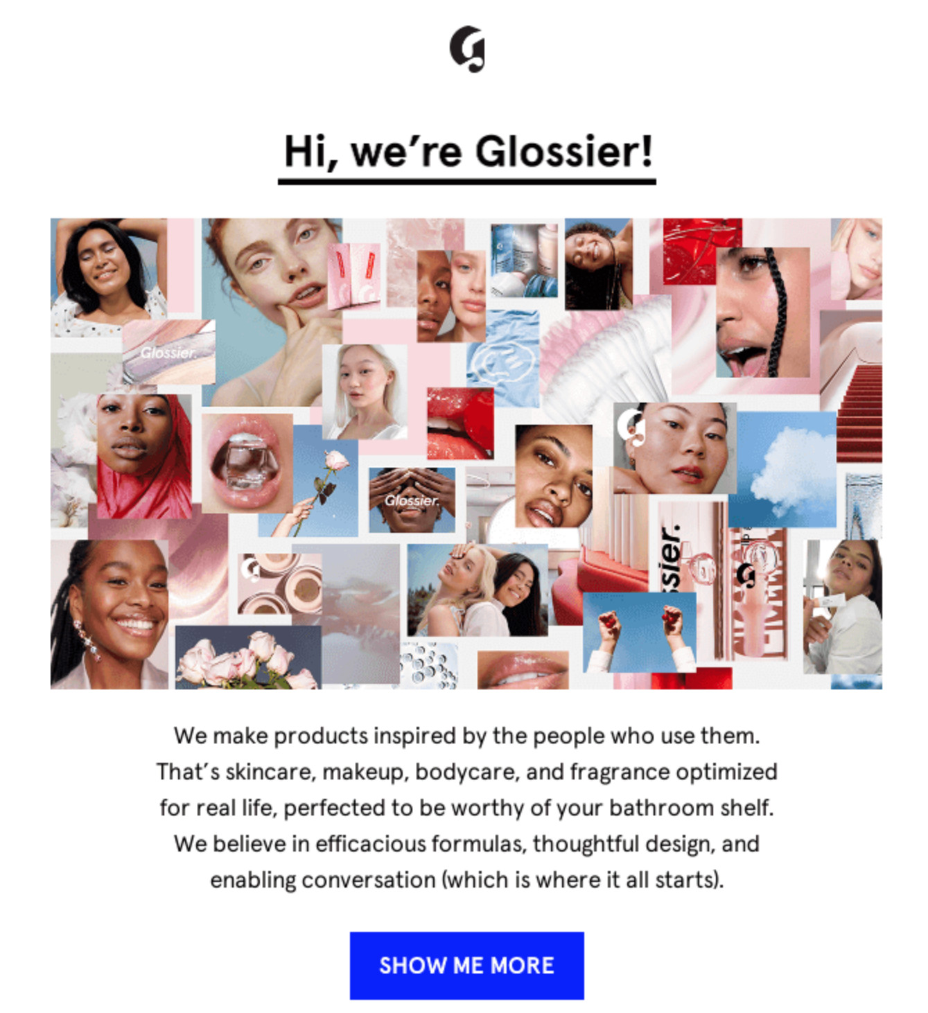 This exceptional welcome email has been carefully crafted to embody the essence of the entire brand. From the moment you look at it, the expert design is evident immediately, leaving a lasting impression. The visually appealing collage, thoughtfully incorporated into the email, adds a perfect touch of creativity and intrigue. It is a captivating introduction, seamlessly guiding readers toward the compelling copy introducing Glossier as a brand. The harmonious combination of expert design and compelling content creates a memorable and immersive experience for recipients, setting the stage for a strong brand connection.