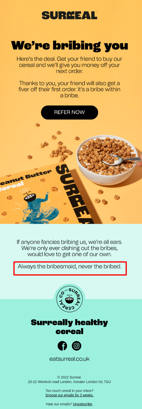 This email is from the cereal brand Surreal, and it made me chuckle with its clever copy. They call incentives “bribes”; it’s lighthearted and eye-catching, showing the user exactly what they need to do.