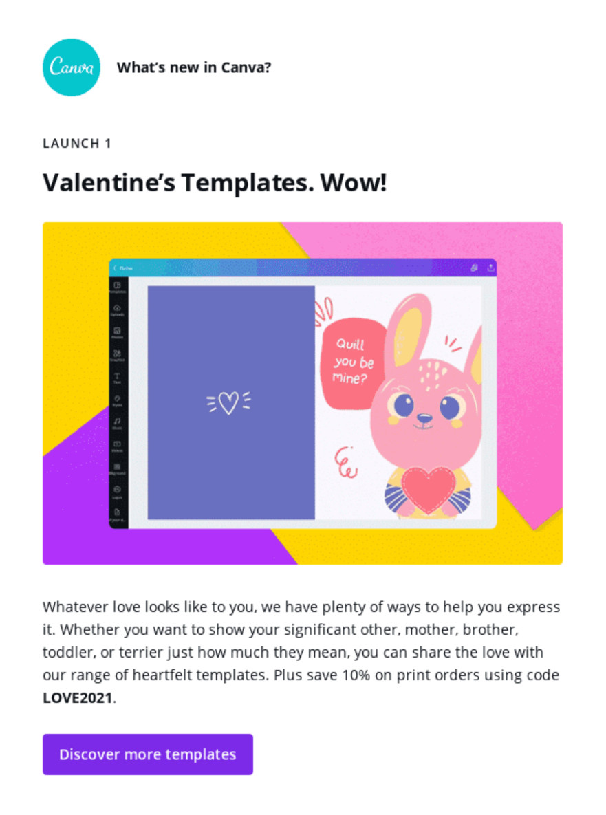 This one is a fantastic example of a seasonal product update. It’s perfect for revamping a type of email that could be mildly engaging and not fancy enough for a user to open and, eventually, click through. Canva has managed to do precisely that.
