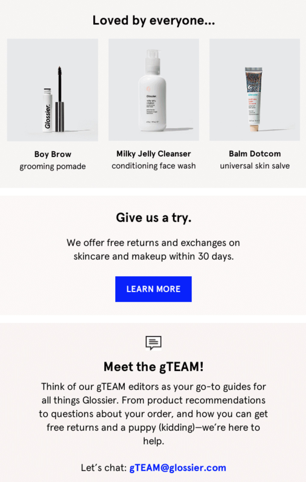 This exceptional welcome email has been carefully crafted to embody the essence of the entire brand. From the moment you look at it, the expert design is evident immediately, leaving a lasting impression. The visually appealing collage, thoughtfully incorporated into the email, adds a perfect touch of creativity and intrigue. It is a captivating introduction, seamlessly guiding readers toward the compelling copy introducing Glossier as a brand. The harmonious combination of expert design and compelling content creates a memorable and immersive experience for recipients, setting the stage for a strong brand connection.