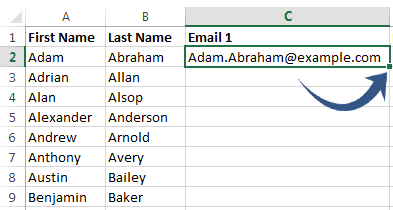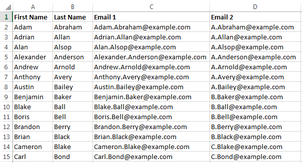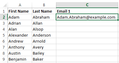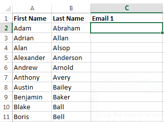 At the first step, copy/paste your first and last names into an excel file in two separate columns. Then, you need to create some email addresses from all the data you have. Let’s assume the first row of your excel file is John Doe. The possible company email for such employee could be [email protected] OR [email protected] OR [email protected]. We need to create 3 possible email addresses for each potential staff. To do so, follow the below steps.