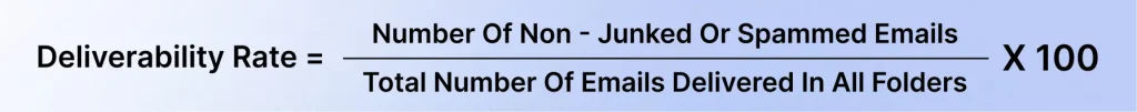 The deliverability rate measures the percentage of emails that you send that end up in the recipient’s inbox. This does not include the emails that end up in any other folder, such as junk, spam, or promotions. For this reason, the delivery rate is also called the inbox placement rate.