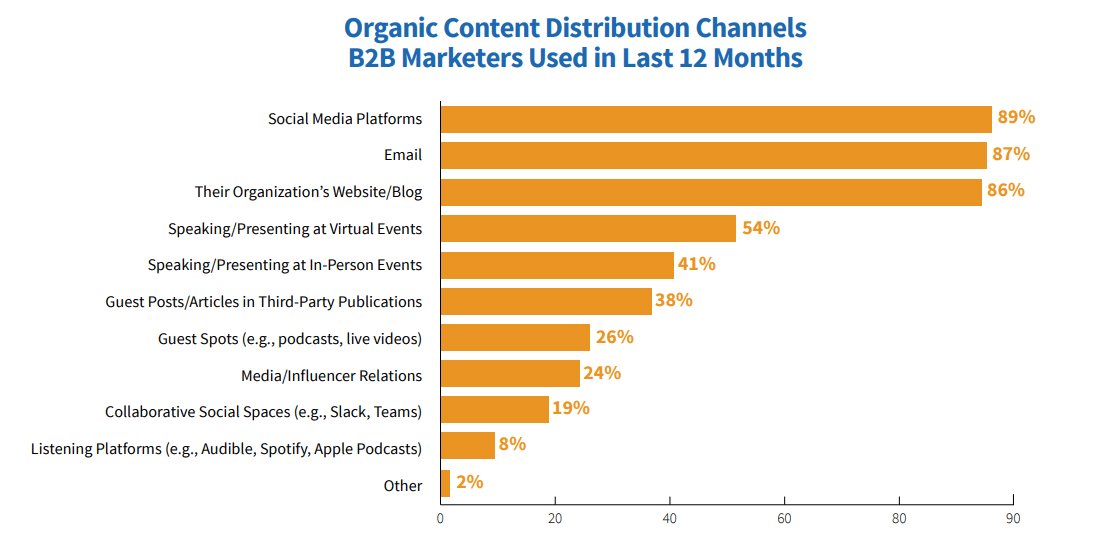 According to research, email newsletters are the second most used content type for 77% of B2B brands. Also, 87% of B2B marketers use email as a top content distribution channel.