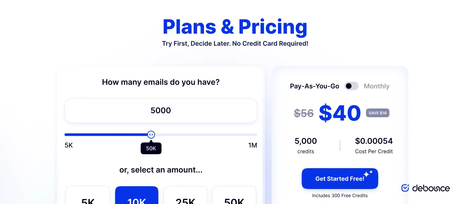 Tools like DeBounce have a flexible credit-based pricing option. This means you don’t have to pay for a subscription when you’re not using the service.