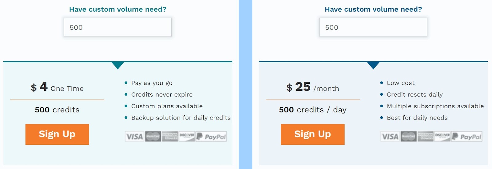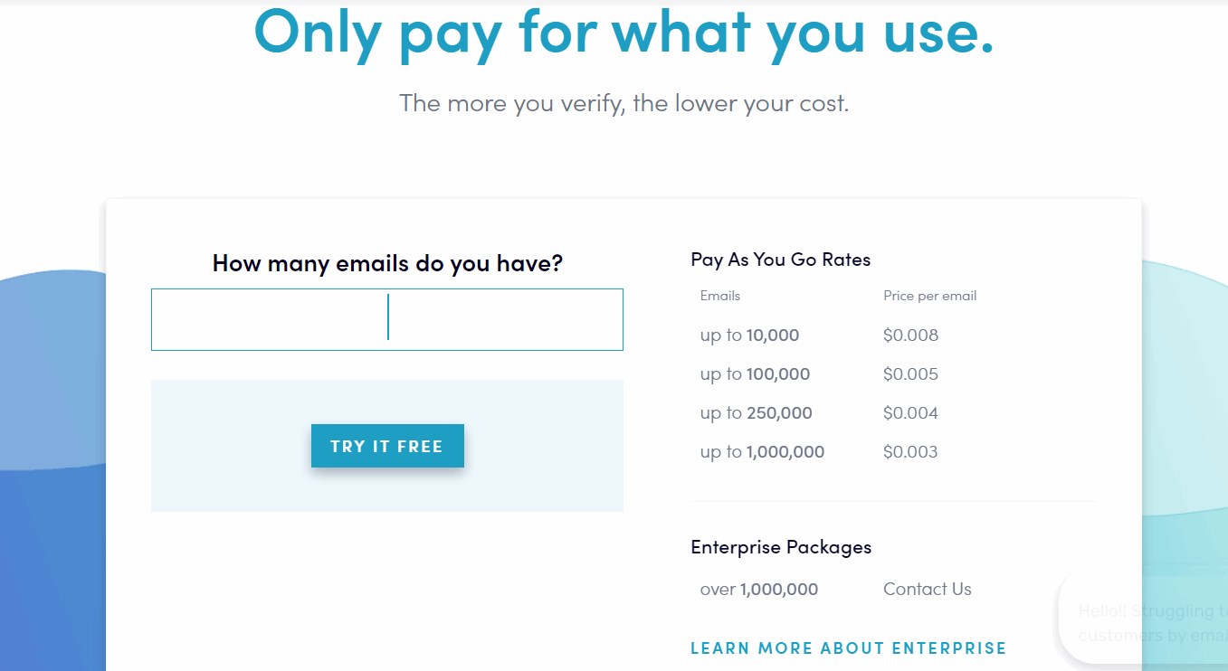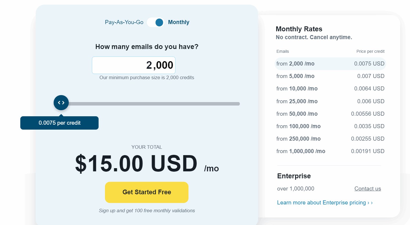 The credit-based pricing starts from $29 per 5000 emails, which can be a bit high for startups and solopreneurs. The monthly plan is suitable for businesses with more regular email verification, especially because you can save $14 on it.