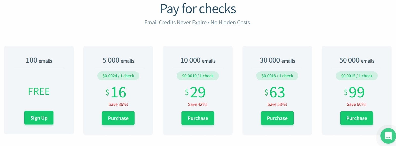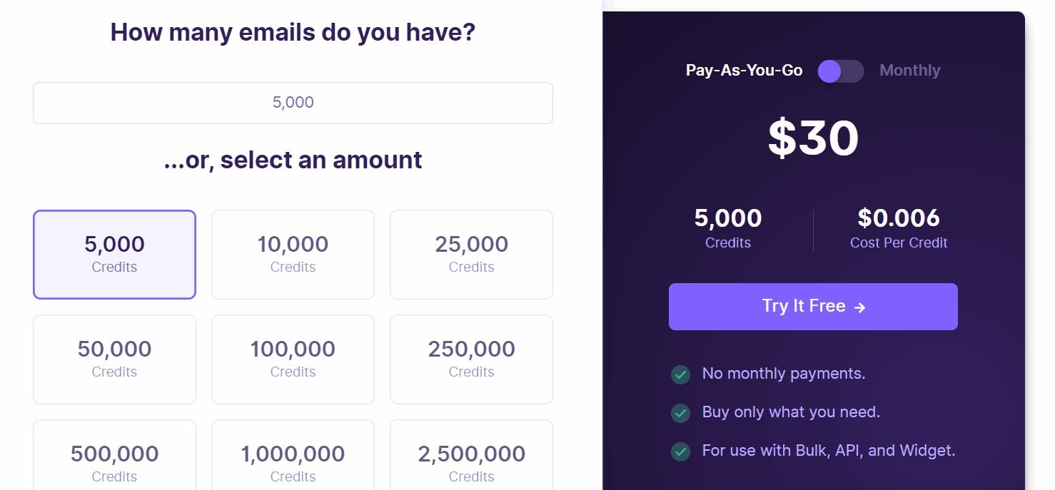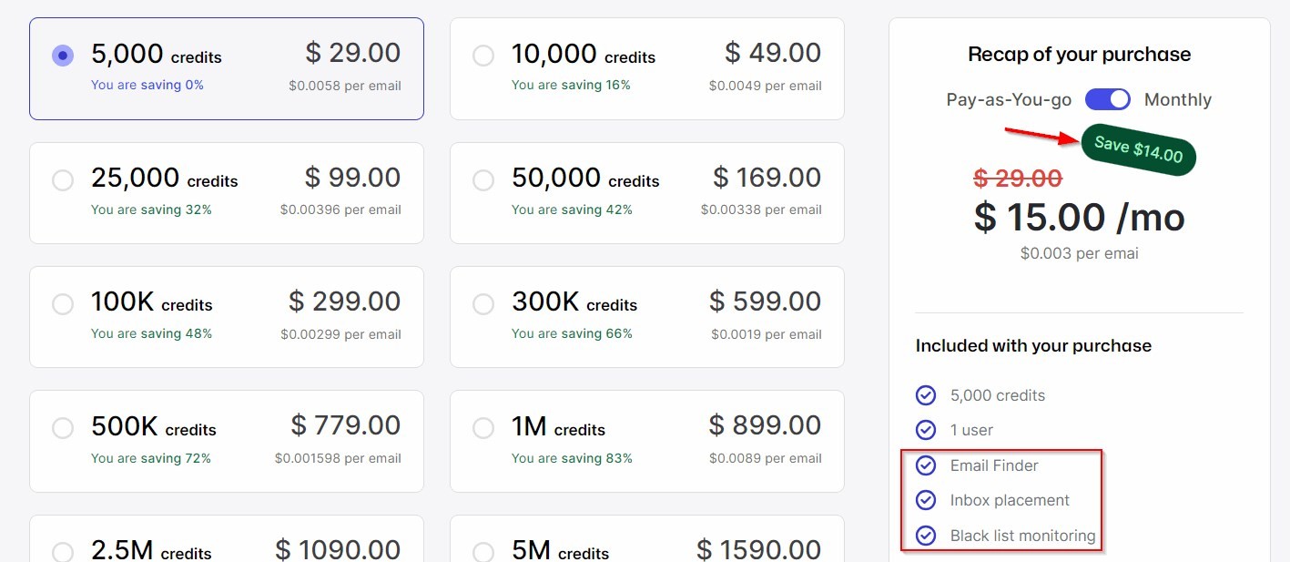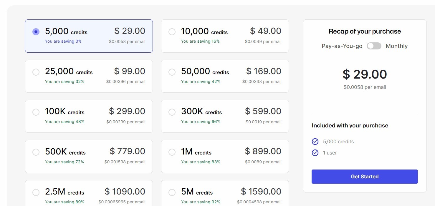 The credit-based pricing starts from $29 per 5000 emails, which can be a bit high for startups and solopreneurs. The monthly plan is suitable for businesses with more regular email verification, especially because you can save $14 on it.