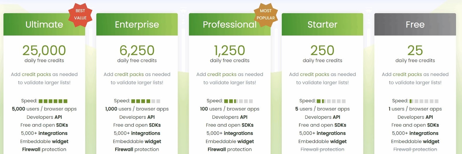 | Cons | No Major Con. | Slightly higher price than some competitors, Some features are difficult to use, Long validation time | Lack of IP reputation verification, Unclear reports, 60-day, list storage time in the cloud | Slightly higher price than some competitors, Complicated API documentation | Fewer plans to choose from, high prices, customer support only via email or live chat, non-responsive support | No spam trap detection, Big files proceeding time is much higher, limited features | Fewer features, complicated pricing, Low performance (long waiting time for verification), No 24/7 support | No monthly plans, Lack of integrations, Support only via form or chat, reports aren’t as detailed as competitors | Difficult initial setup, Fewer integrations, Lack of Disposable Email Detection, Lack of spam tests, | No 24/7 support, Difficulties with API | Confusing pricing, Limited integrations, complaints about customer support, Expensive pay-as-you-go plans, Customer support not available for US time zone | Poor catch-all detection, problem with Yahoo email verification, unresponsive customer support | Difficult API setup process, Limited integrations, Problems with spam traps. UX issues, | No money-back, No monthly subscription or free trial, Low versatility, only basic features, Can be slow |