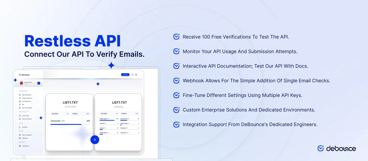 To verify your email list, connect DeBounce’s API. It gives you 100 free verifications to test the API.
