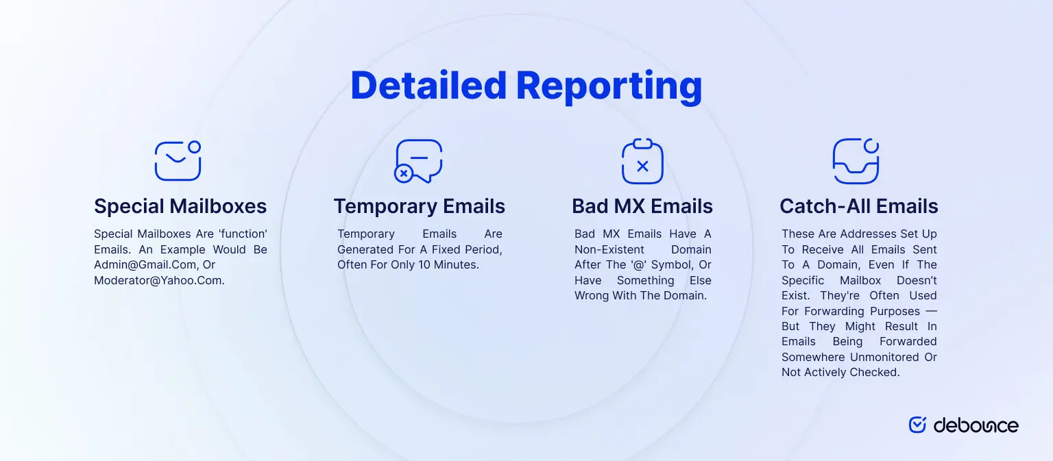 DeBounce doesn’t only provide a comprehensive email verification service, but it also provides in-depth reporting.