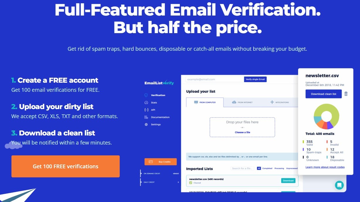 EmailListVerify is one of the most affordable options in the market. The obvious trade-off is limited features.