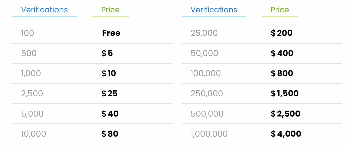 Xverify has a flexible, pay-as-you-go pricing model. The price vaires depending on the number of emails you want to verify. It tends to be higher as the number of emails decreases. For instance, 1000 emails cost $10. This can be a bit expensive compared to other services in the market. Overall, there are no commitments and setup fees.