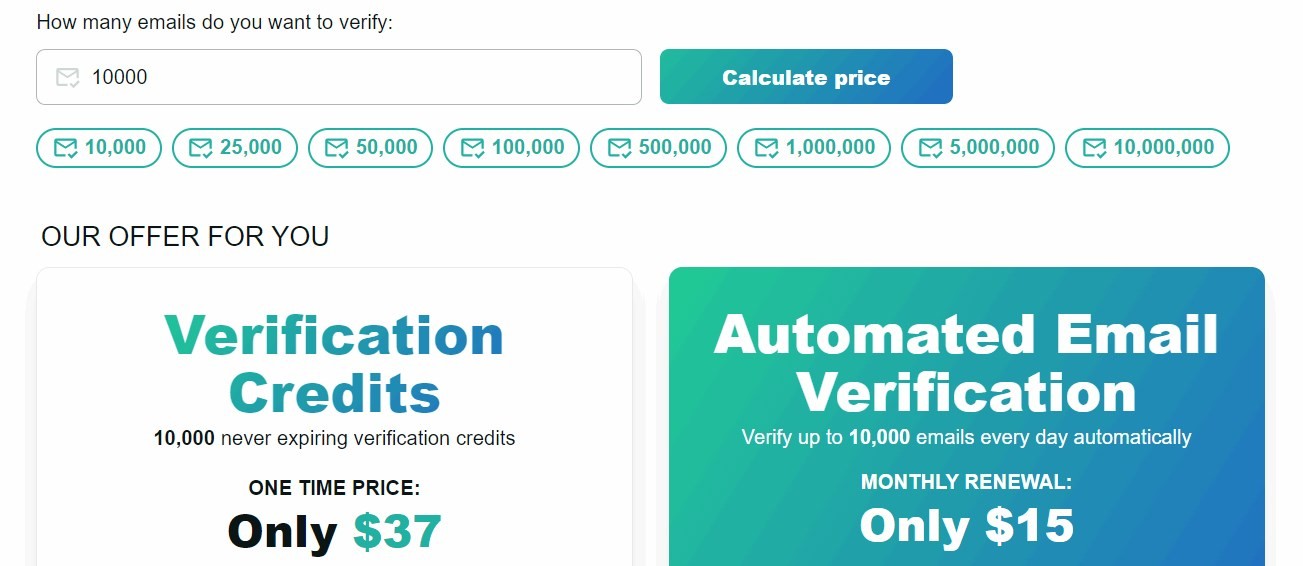 MillionVerifier has a simple credit-based pricing model and a monthly subscription. 10k email credits cost $37 (One-time). Whereas, the cost of 2k credits is just $4.9 (One-time). Impressively, the credits never expire, meaning that you can use them whenever you want. The monthly subscription costs less, with just $15 per month for 10k emails per day.
