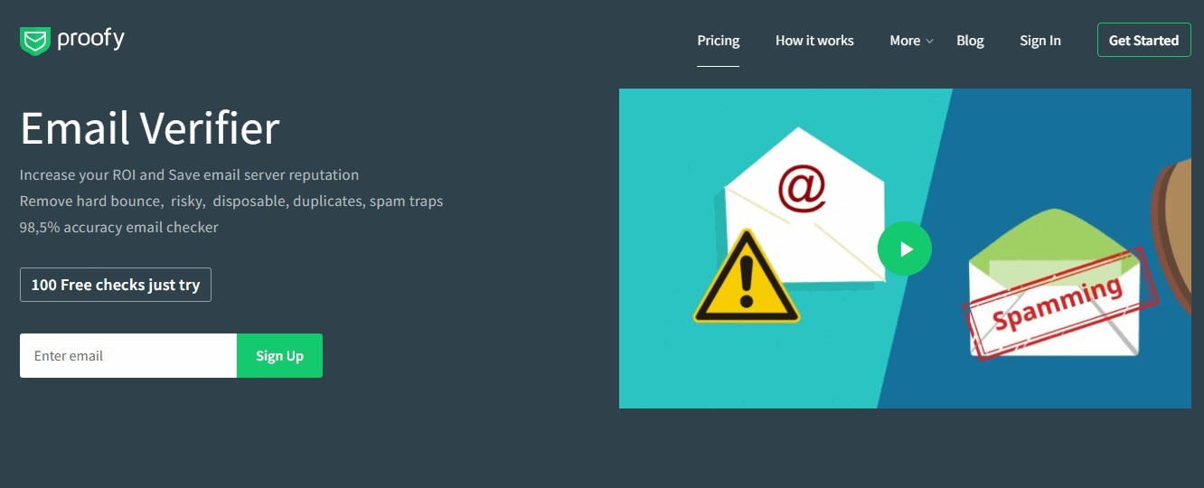 | Pros | Easy-to-use, Free to get started, Money-back guarantee, great accuracy and Performance, Flexible pricing, High security standards | 24/7 customer support, 100 free monthly validations, Detailed Status Codes, Unknown results are free, never-expiring credits | 60-day money-back guarantee, 24/7 Customer Support, Single and bulk email finder feature, fast valiation, never-expiring credits | 250 free credits, Unknown results are free, never-expiring credits | Easy-to-Use, automated list cleaning, high accuracy, never-expiring credits | Preferred currency selection, Powerful API, Credits never expire, Custom plans available | High security, Easy to integrate, with other tools, High accuracy, Easy to use | Role email detection, High-risk detection, Free bulk trial plan with 500 credits, | 24/7 support, functional API, Easy integration with other validity tools | Flexible pricing, , Domain Verifier, Multi-user setup, High accuracy (enterprise and ultimate plans) | 500 free credits, , Email finder, Bulk finder, Support for various list formats, In-depth reports | Credits never expire , Duplicate removal, Easy to use, 100% Money Back Guarantee | 100 verifications for free, Using CSV, XLS, TXT and other list formats, never-expiring credits | Blacklist monitor, auto-correction for misspellings, 24/7 support |