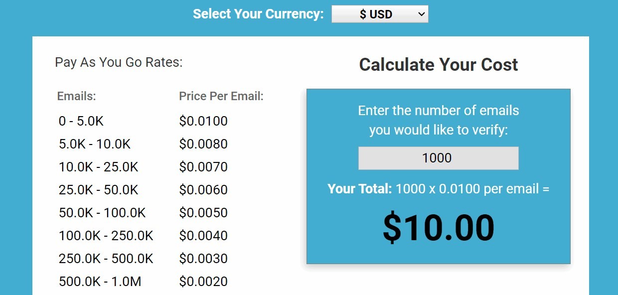 DeBounce has a pay-as-you-go pricing model. The cost depends on the total number of verifications. For instance, for just $10, you can verify 5000 emails.