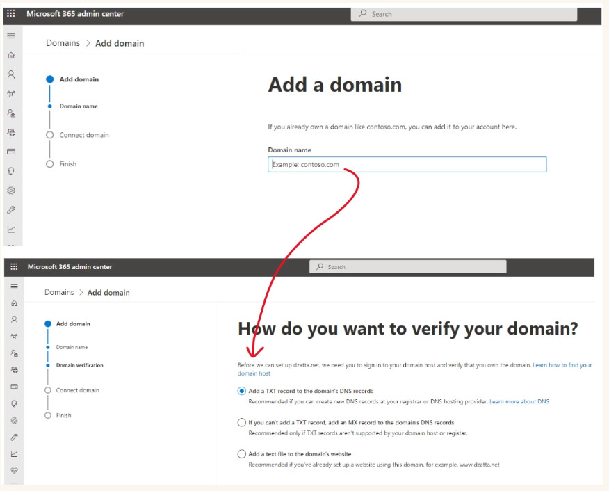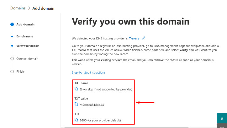 When you choose the domain verification option, you can easily find instructions on verifying your domain. Retrieve your domain name from your provider’s account dashboard and add the TXT record to your domain registrar or web hosting account. Once you confirm the process and verify your domain name, you can move to the MX records step.