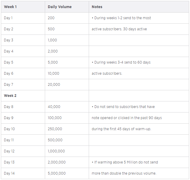 The more consistent you are with volume, frequency, complaint and bounce levels during the warm – up phase, the faster you create a positive reputation for sending. If you send rarely, it will take more time to build a positive reputation for sending anything less than a week. Remember to check the activity of the recipients throughout the warm – up period — if it is low, slow down and do not increase the daily volumes before you begin to notice positive changes in the engagement of the subscribers.