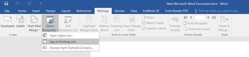 1. In the “Mailings” tab, click on “Select Recipients” and choose “Use an Existing List.”