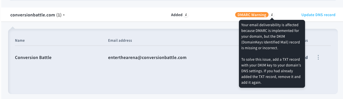 - Domain: Confirms that the necessary DNS records (DMARC, DKIM, SPF) are published and accessible