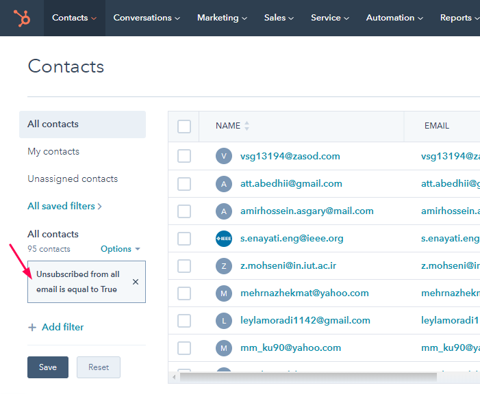 We do not erase the emails; we opt-out email addresses from future communications. Here is how you can find opted-out emails: Navigate to the contacts section of your HubSpot account and filter the “Unsubscribed from all email -> True”. You should see something like this: